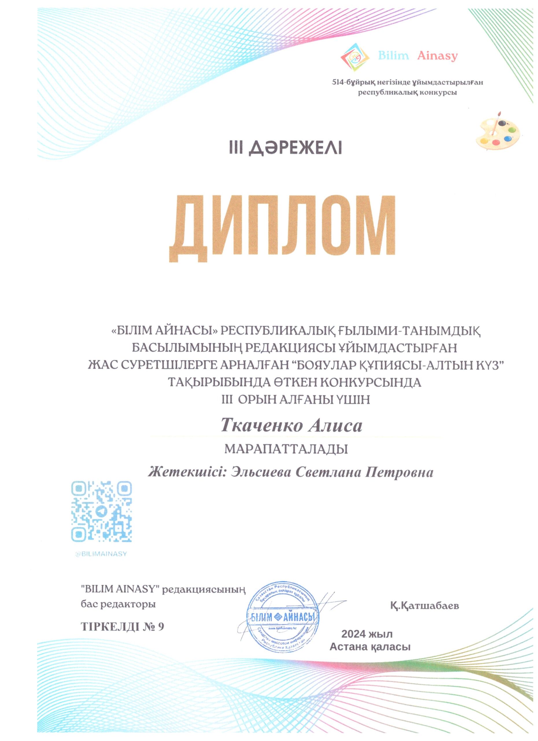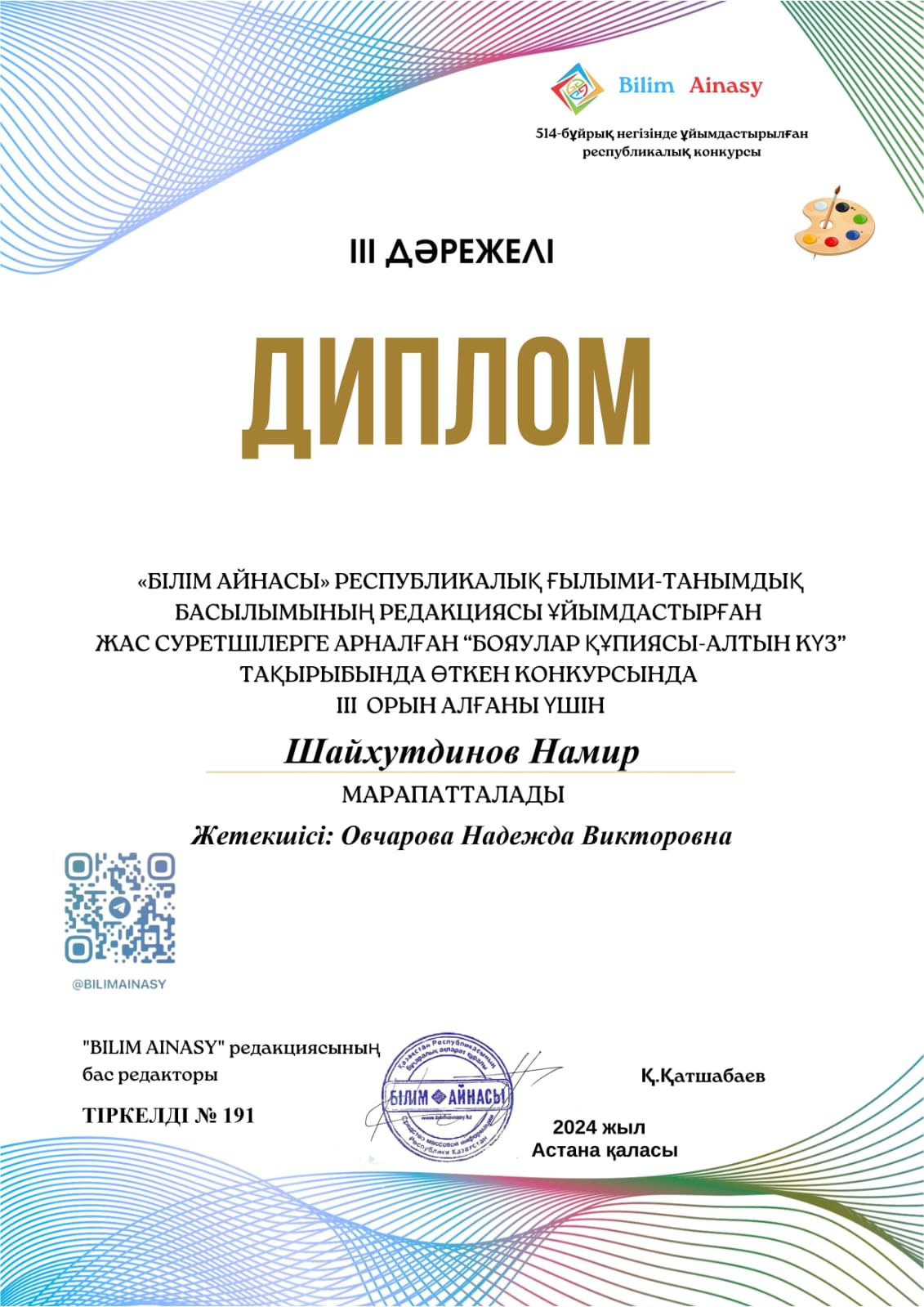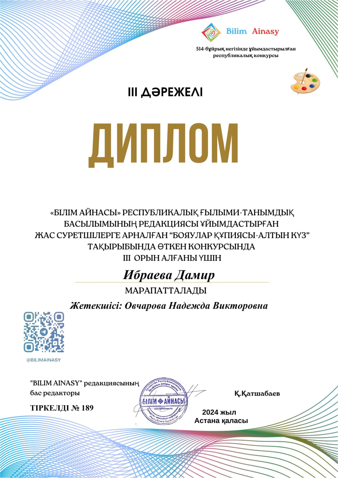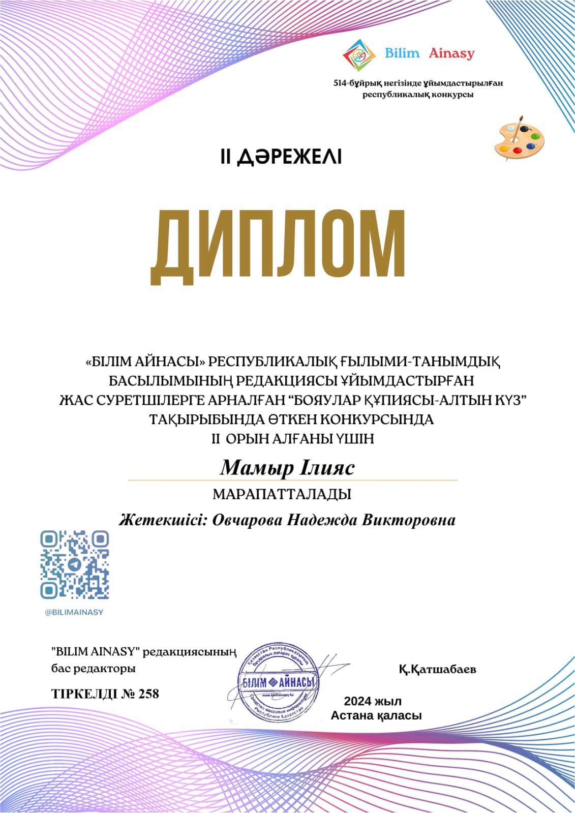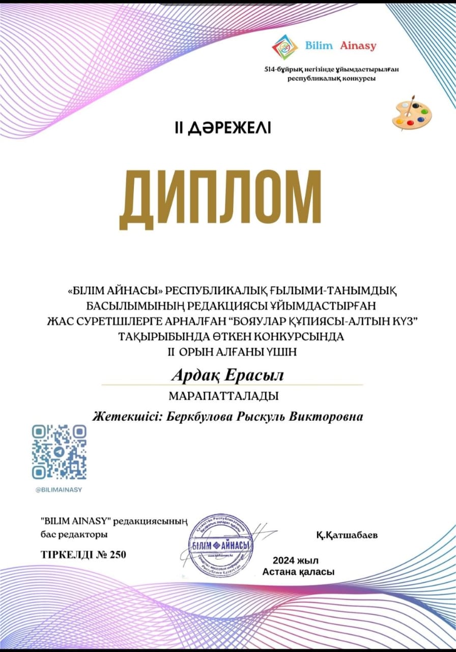 В конкурсе для юных художников «Бояулар құпиясы -Золотая осень» , организованный Республиканским научно-познавательным изданием » Bilim Ainasy», приняли участие наши воспитанники Мамыр І., Ибраев Д., Казачков Г., Шайхутдинов Н., Ардақ Е., Савонин А., Ткаченко А., они награждены дипломами 2 и 3 степени.