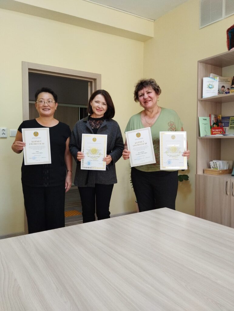 Мұғалімдер күніне орай біздің кабинетіміздің педагогтері Қазақстан Республикасының Оқу-ағарту министрінің «Құрмет грамотасымен» мұғалім-логопед Ким Ольга Олеговна, ЕДШ мұғалімі Дегтярева Татьяна Олеговна марапатталды. Сондай-ақ, Қарағанды облысы білім басқармасының «Алғыс хатымен» мекемеміздің директоры Эльсиева Светлана Петровна мен ЕДШ мұғалімі Дегтярева Татьяна Олеговна марапатталды.
