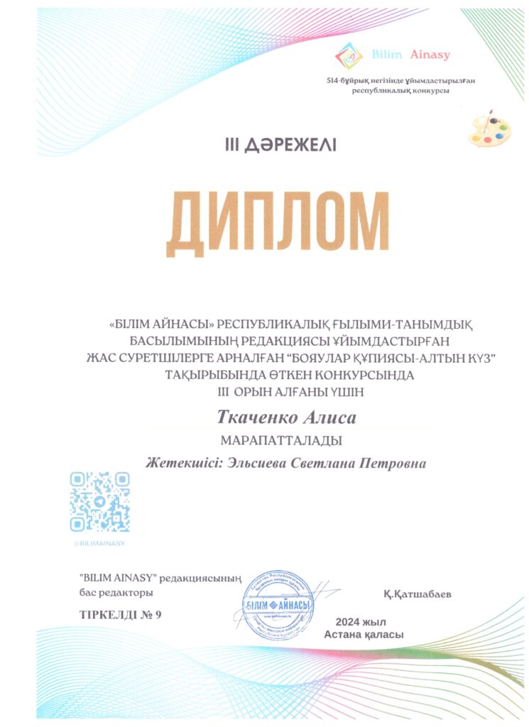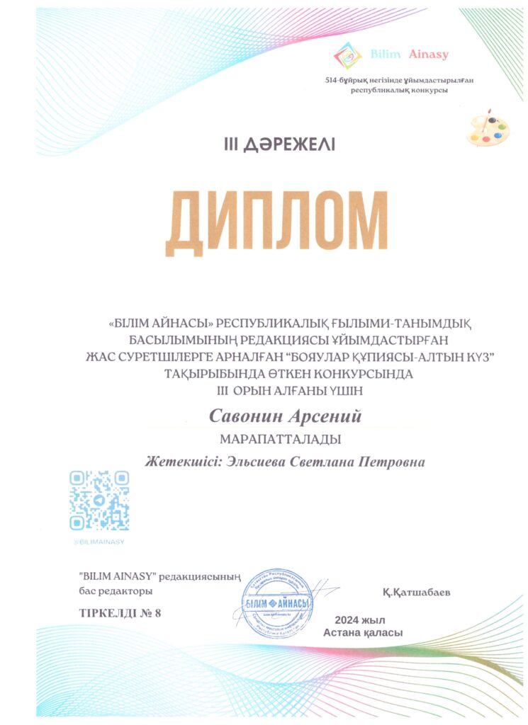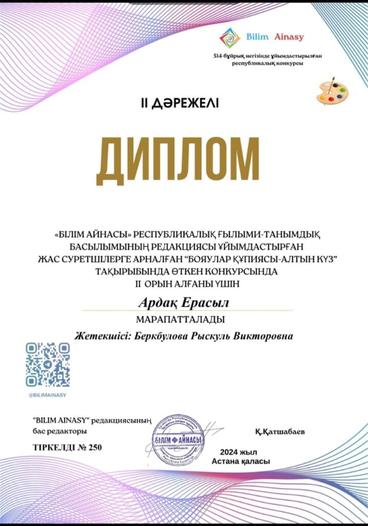В конкурсе для юных художников «Бояулар құпиясы -Золотая осень» , организованный Республиканским научно-познавательным изданием » Bilim Ainasy», приняли участие наши воспитанники Мамыр І., Ибраев Д., Казачков Г., Шайхутдинов Н., Ардақ Е., Савонин А., Ткаченко  А., они награждены дипломами 2 и 3 степени.